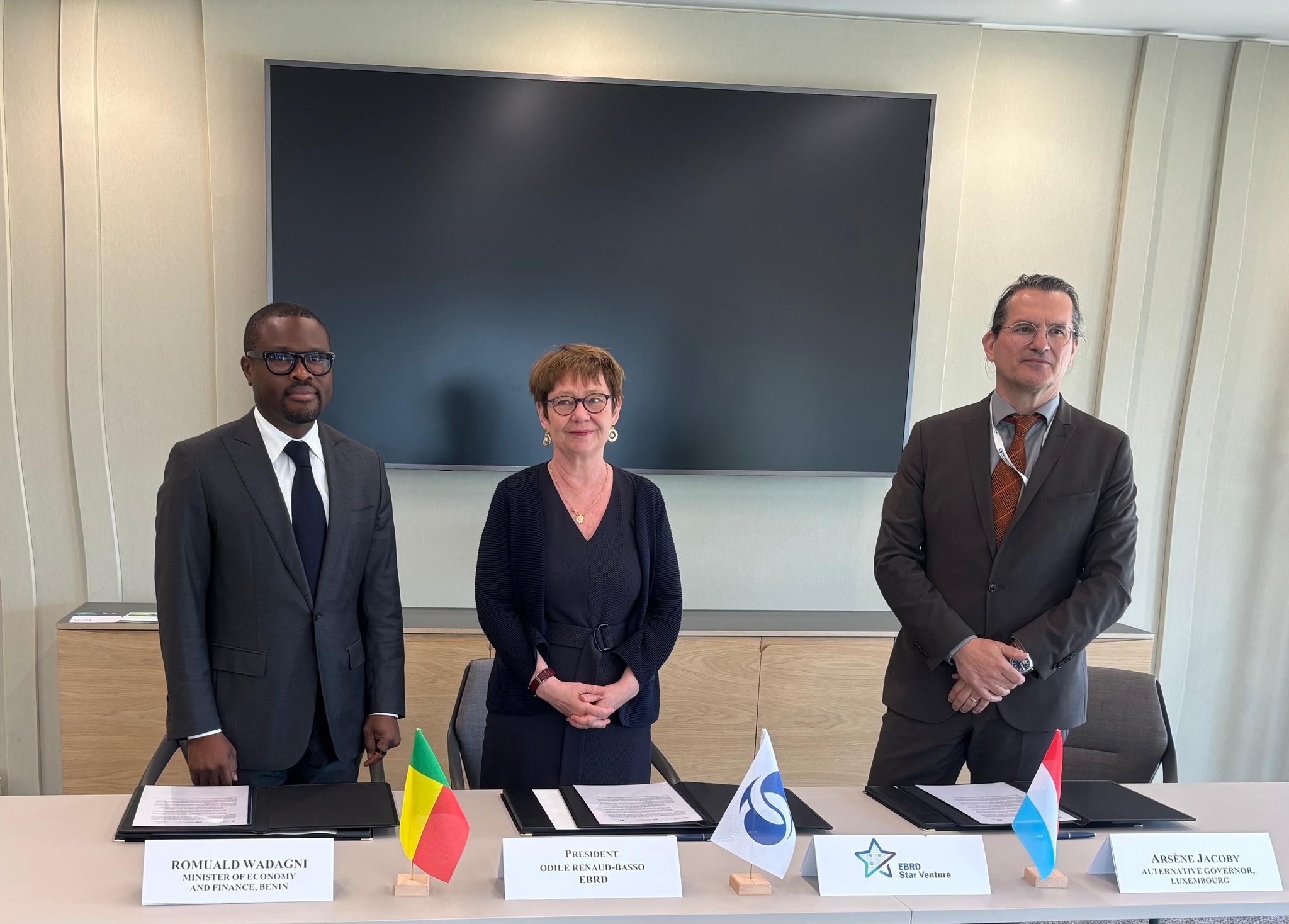 La cérémonie de signature s’est tenue en présence de Monsieur Romuald WADAGNI, Ministre d’État, Ministre de l’Économie et des Finances, en charge de la Coopération du Bénin, de Madame Odile RENAUD-BASSO, Présidente de la BERD, ainsi que de représentants du gouvernement luxembourgeois.